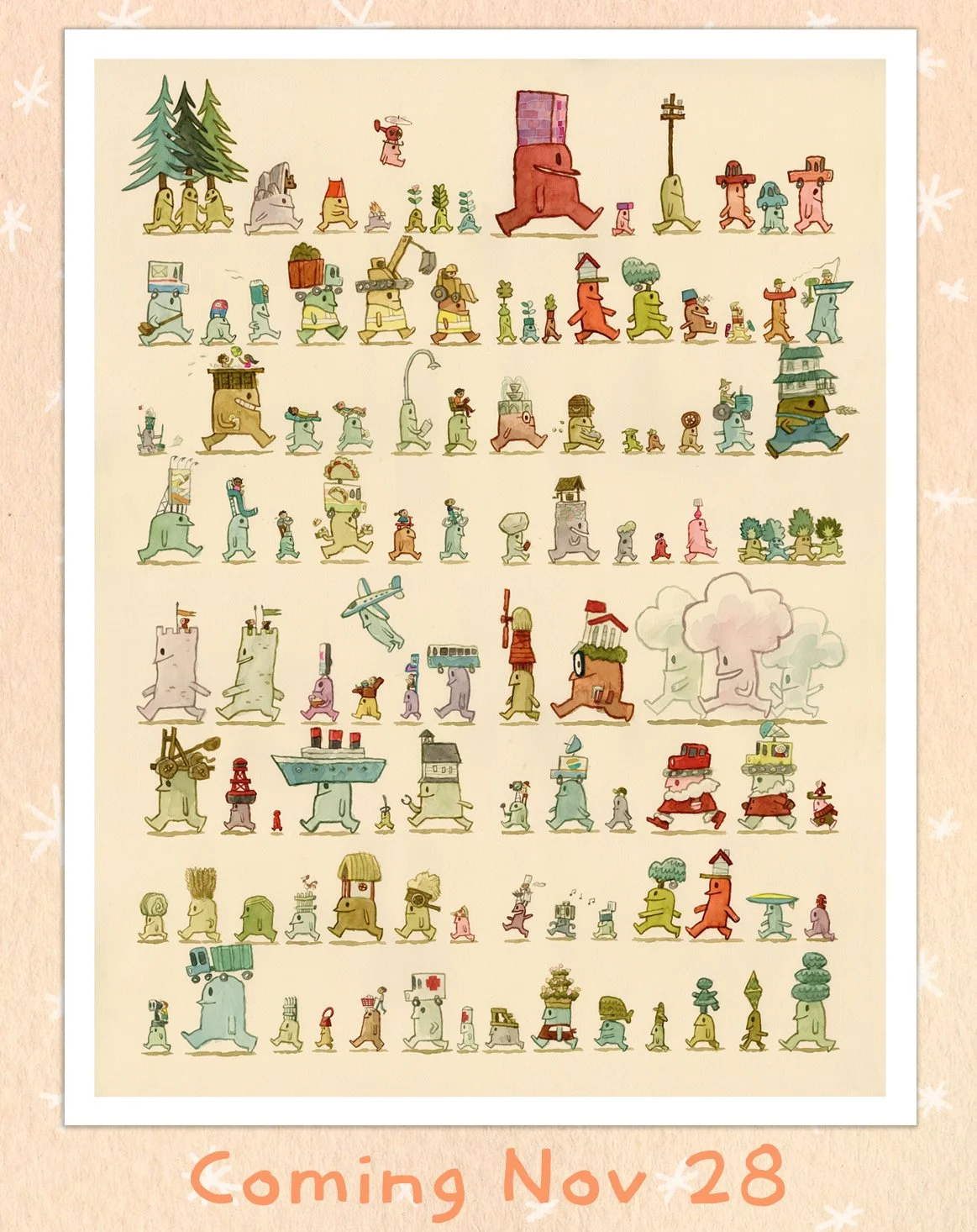 The entire cast of the debut book of my Cabin Head and Tree Head graphic novel series are marching on into this holiday season on this beautiful new poster for you! They all love the holidays. Especially Cabin Head, Tree Head, and Garden Head.