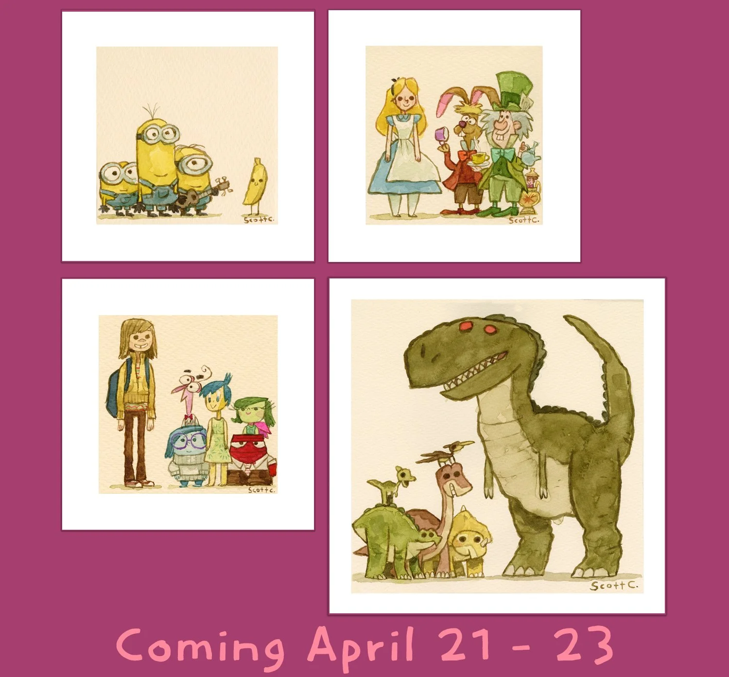 This month we welcome 4 new timed edition prints to the Great Showdowns family: "The Yellow Ones", "The Tea Party", "The Feeling Friends", and "The Prehistoric Ones" . All will go live in the Scott C Shop next Tuesday, April, 21st @ 1pm EST.